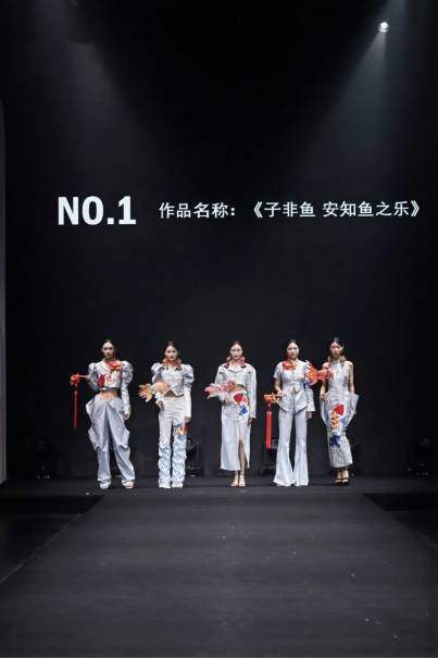 《子非鱼,安知鱼之乐》这一作品灵感来源于安徽非物质文化遗产——鱼灯。设计师们巧妙地将这一传统元素与现代时尚相结合,通过夸张的服装廓形和独特的色彩搭配,展现了鱼灯的韵味与魅力。作品以灰蓝色为主色调,搭配饱和度较高的鱼的图案,色彩搭配既不失传统韵味,又充满了现代感。在工艺上,作品采用了滚边条、贴布绣以及亮片等多种手法,将鱼的图案生动地呈现在服装上。每一处细节都经过精心打磨,展现了选手们对工艺的热爱和追求。
