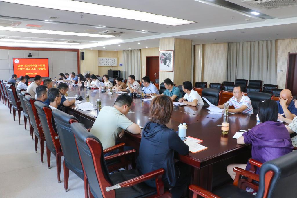 未觉夏暑尽,时序已新秋。8月22日,我校召开2024-2025学年第一学期全体中层及以上干部会议,研究部署开学相关工作,明确目标任务,理清工作思路,确保新学期开学工作安全、平稳、有序。学校领导班子成员、全体中层及以上干部参加会议,校党委书记杨三龙主持会议。