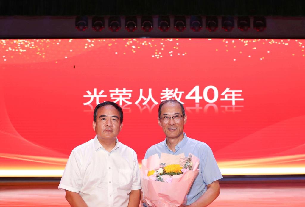 光荣从教四十载,提灯引路谱华章。在全场热烈的掌声中,校党委书记杨三龙为刘光余老师颁发“光荣从教40年”纪念水晶和鲜花。四十年初心不改,四十年矢志不渝,刘光余老师用实际行动诠释了新时代教育家精神,为广大教师树立了榜样。