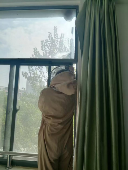 保安队员们身穿防护服,手持特制工具和杀虫喷雾剂,对蜂窝进行喷雾、点火、铲除等一系列操作,成功除掉蜂窝。建工大棚的蜂窝位置较高,安全保卫处与校内施工队联动,借助升降车成功将马蜂窝铲除。