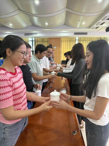 紧接着,丁志方处长宣布了今年第八届蓝青工程的结对子教师名单。在庄重而温馨的氛围中,第八届蓝青工程18位青方教师为蓝方教师行敬茶礼,表达了他们深深的敬意和感激之情。蓝方教师则回赠了图书《边教书,边成长》并附上寄语,寄托着对年轻教师的殷切期望和美好祝愿。