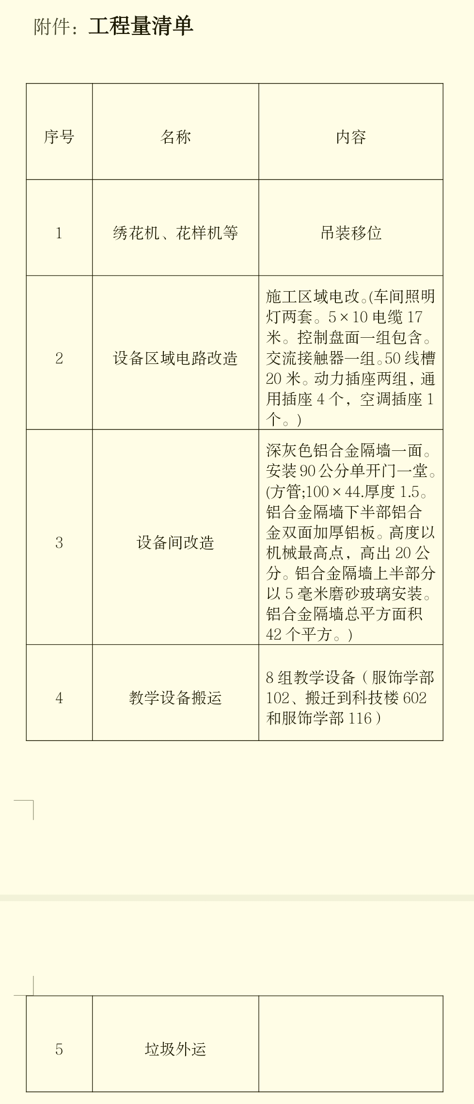 项目内容:1、绣花机、花样机等吊装移位 2、设备区域电路改造3、设备间改造 4、教学设备搬运(详见附件)
