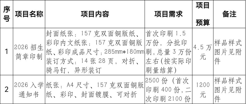 为宣传我校办学优势和办学特色,学校计划通过公开招投标方式印刷2026年招生简章,欢迎具备资质的单位参与竞标。