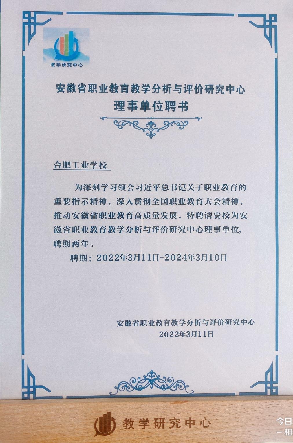 我校受聘为安徽省职业教育教学分析与评价研究中心理事单位