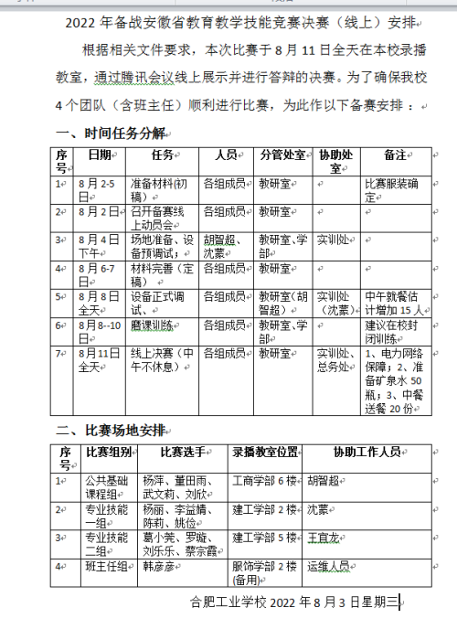 2022年安徽省中等职业学校教育教学技能竞赛暨全国职业院校技能大赛教学能力和班主任业务能力比赛选拔赛决赛于8月1日正式拉开帷幕,合肥工业学校葛小莞团队、杨丽团队、杨萍团队、韩彦彦团队共四支队伍以澎湃的激情、高昂的斗志投入到紧张备赛中,在校长室领导下,教研室全程做好统筹安排,各处室全力做好服务保障工作。