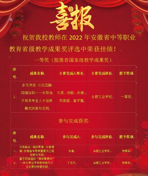 11月1日,安徽省中等职业教育省级教学成果奖获奖揭晓,我校高级讲师、电子商务教研组组长方英老师所率领的研究团队申报的成果——《多元共促 三化互融 四强协同——中职电子商务专业人才培养模式改革与实践》荣获省级教学成果奖一等奖,并被推荐国家级教学成果奖评选。