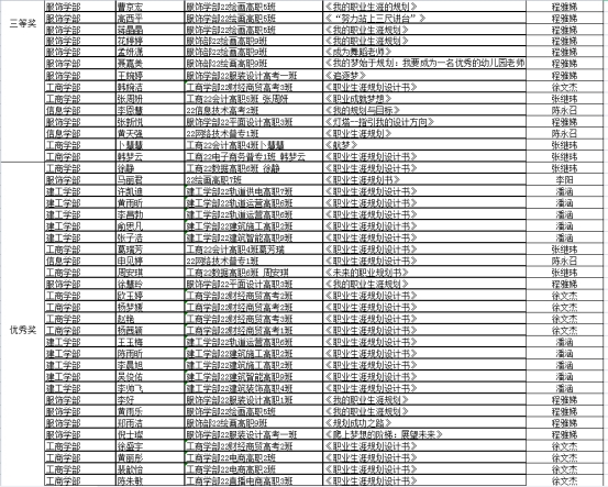 经过评委老师的认真评选,最终产生第二届职业生涯规划设计书比赛一等奖22服装设计高职1班唐珂等8名同学,二等奖22财经商贸高考3班费菲等17名同学,三等奖工商22连锁经营高职8班付宁宁等24名同学,优秀奖工商22数据高职6班徐静等29名同学。在这些优秀的作品中看到了学生们对自己未来清晰明确的规划及详细的行动指南。