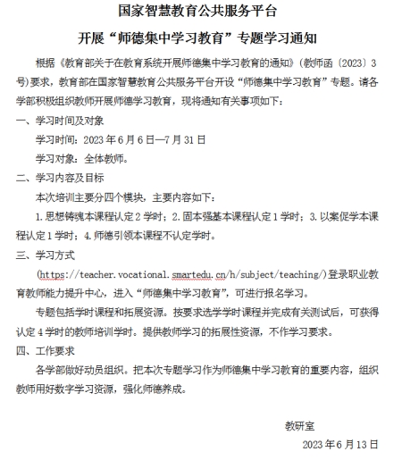 我校一直以来高度重视师德师风建设,近期根据《教育部关于在教育系统开展师德集中学习教育的通知》(教师函〔2023〕3号)要求,利用国家智慧教育公共服务平台开设“师德集中学习教育”专题,要求全体教师在线学习。为此,谢丹副校长在全校教职工大会作了动员讲话,要求各位老师用好数字学习资源,强化师德养成,之后,教研室作了活动的布置工作。