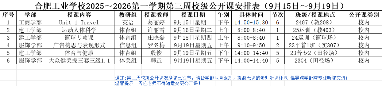 合肥工业学校2025~2026第一学期第三周校级公开课安排表(9月15日~9月19日)