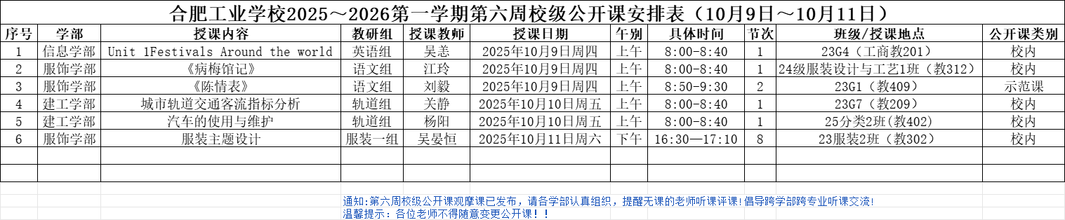 合肥工业学校2025~2026第一学期第六周校级公开课安排表(10月9日~10月11日)