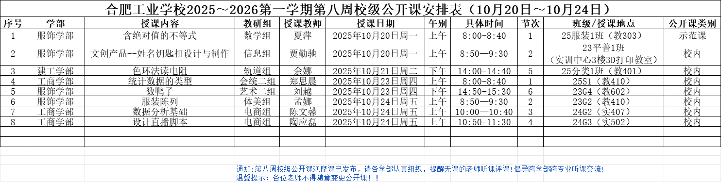 合肥工业学校2025~2026第一学期第八周校级公开课安排表(10月20日~10月24日)