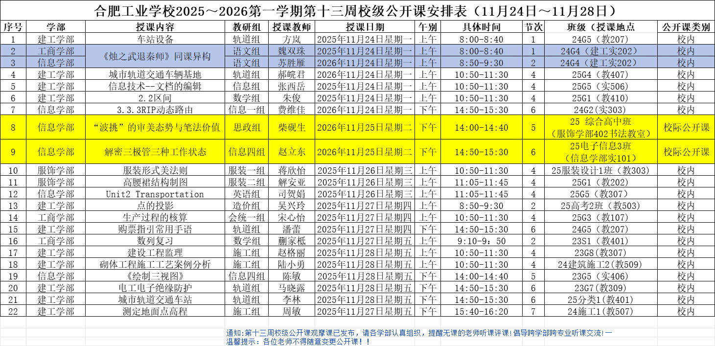 合肥工业学校2025~2026第一学期第十三周校级公开课安排表(11月24日~11月28日)
