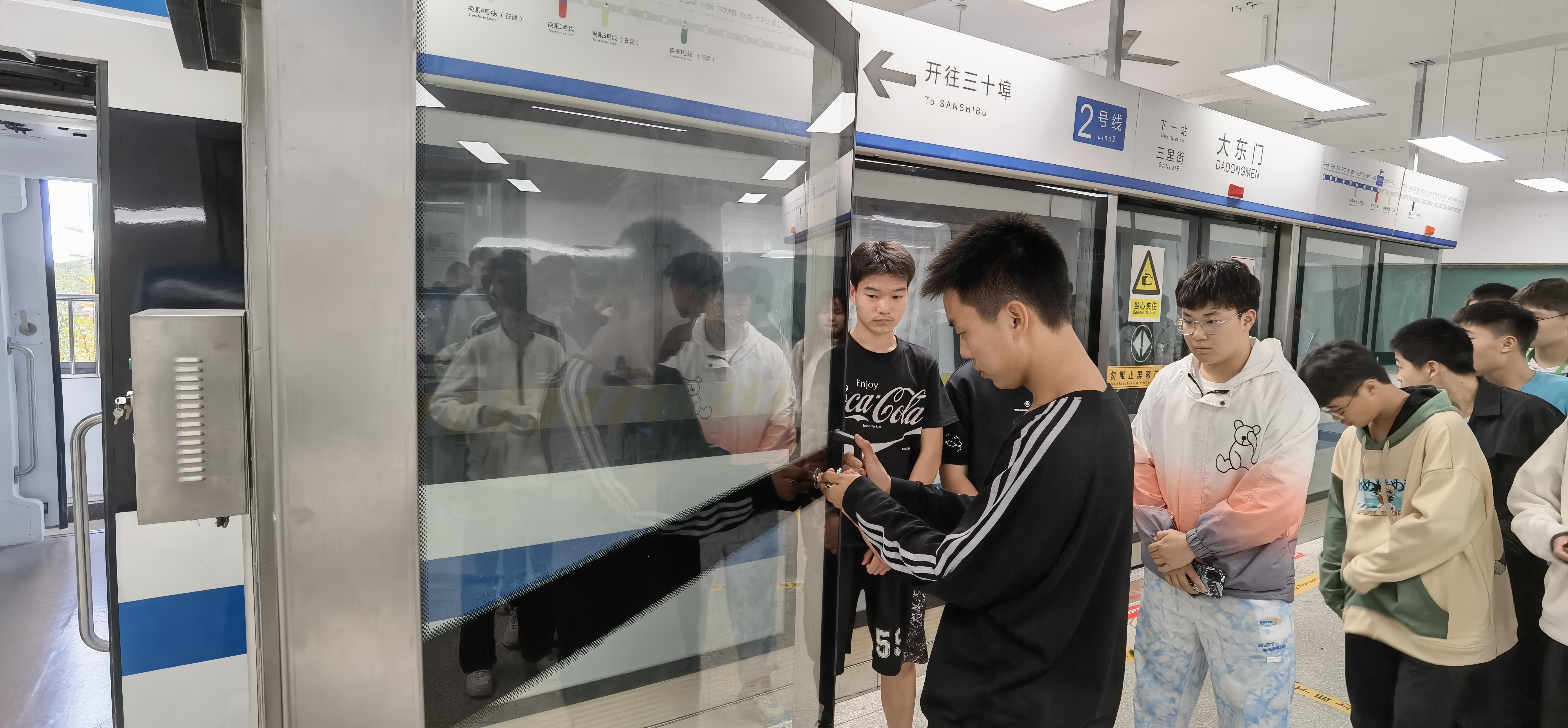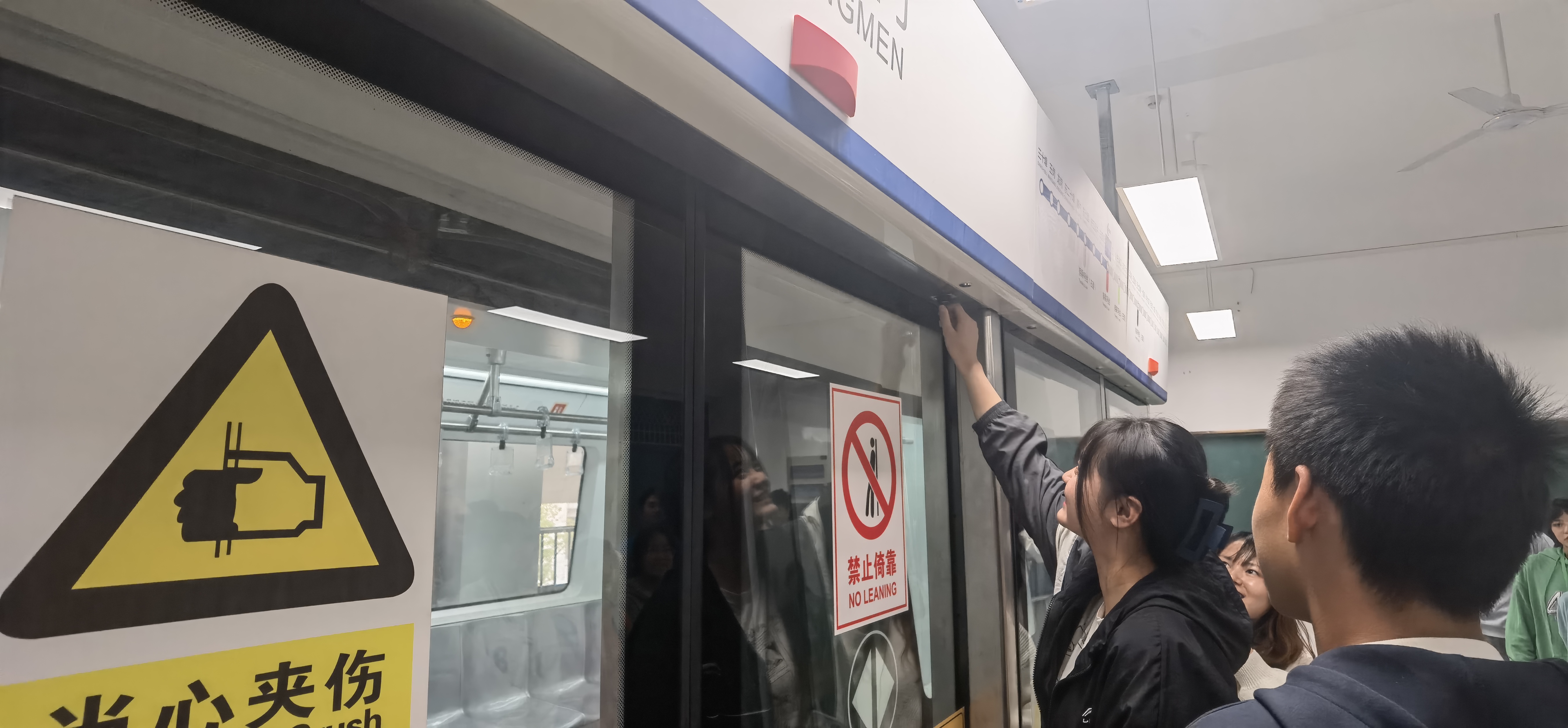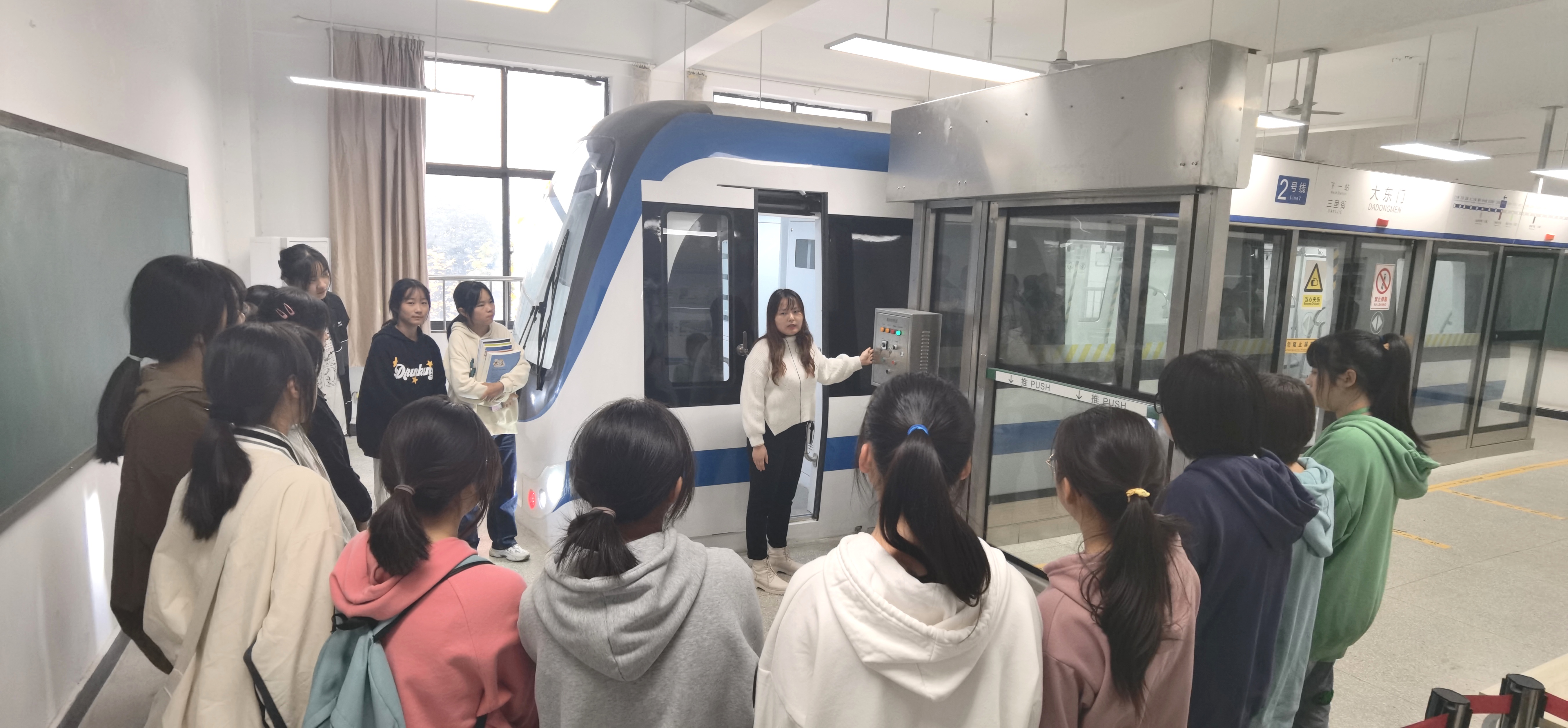 潘蕾老师给同学们介绍了屏蔽门系统的结构,演示了屏蔽门的三种控制方式,组织同学们参观了车厢内部。