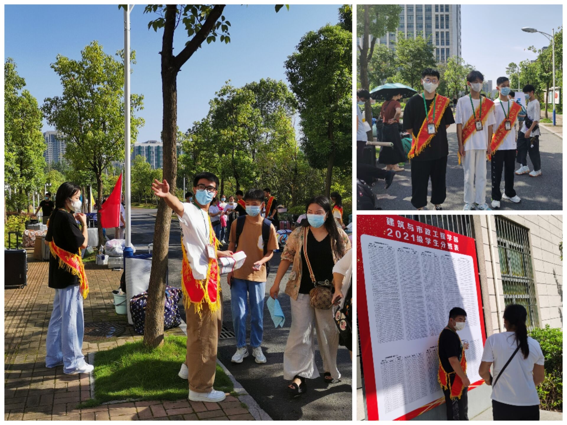 按照疫情防控要求,学生和家长进校需要检验安康码、佩戴口罩和测温。在校园内到处可以看到欢迎新生的标语,人性化的道路指引标识,面带微笑的志愿者,以及不辞辛苦的工作人员,让学生和家长们倍感亲切。