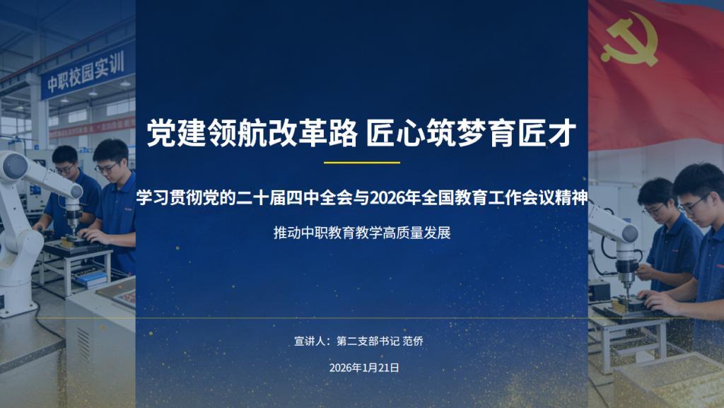 为深入学习贯彻党的二十届四中全会及2026年全国教育工作会议精神,切实把会议精神转化为推动中职教育教学改革的实际行动,1月21日,中共合肥工业学校委员会第二支部召开全体党员大会暨“党建领航改革路 匠心筑梦育匠才”专题党课。会议紧扣“十五五”开局之年职教发展任务,以党建为引领,聚焦育人初心,凝聚起全体党员攻坚克难、深耕职教的奋进力量。