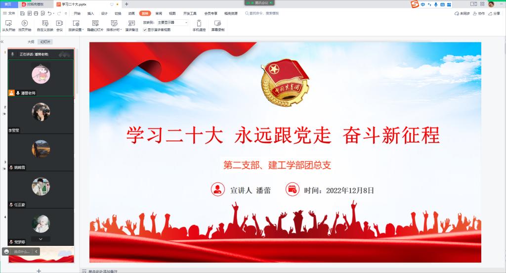 2022年12月8日下午15:30,建工学部开展“学习宣传贯彻党的二十大精神”宣讲暨主题团日活动,第二支部支委、建工学部团总支书记潘蕾同志通过腾讯会议面向建工学部团员学生和团员青年教师宣讲党的二十大精神。