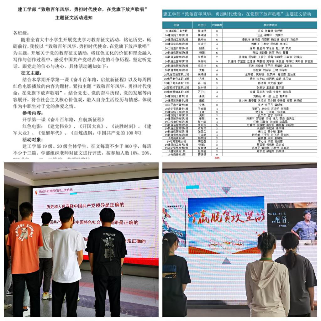 随着全省大中小学生开展党史学习教育,铭记历史,砥砺前行,我校以“致敬百年风华,勇担时代使命,在党旗下放声歌唱”为主题,开展一系列关于党史的教育活动,将红色文化的价值和理念融入到学生的学习与生活中。建工学部贯彻活动要求,第二党支部、团总支、德育教研组联合开展党史学习主题征文活动。