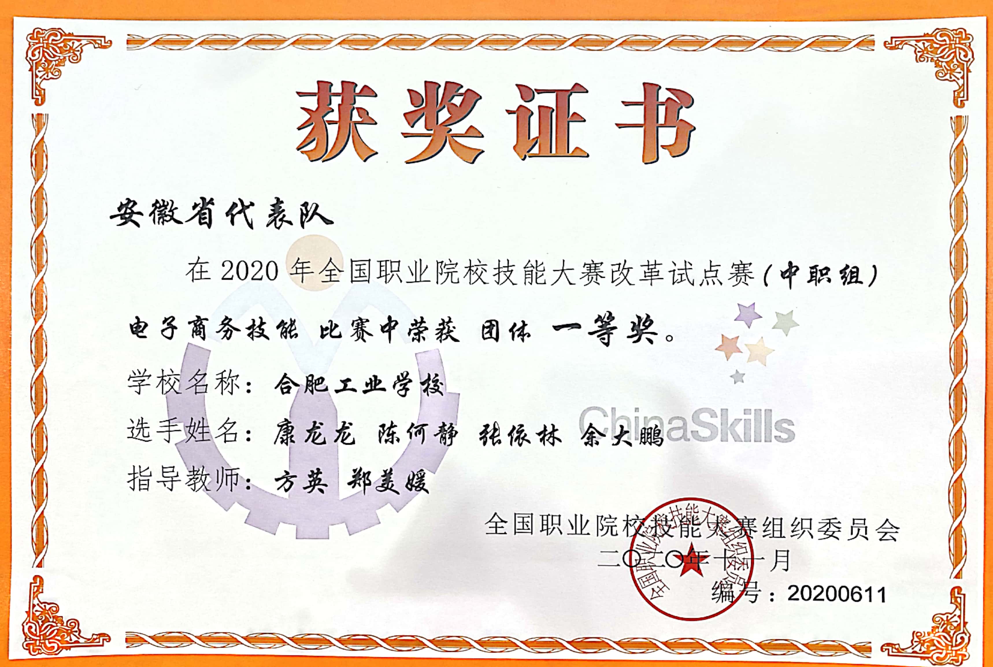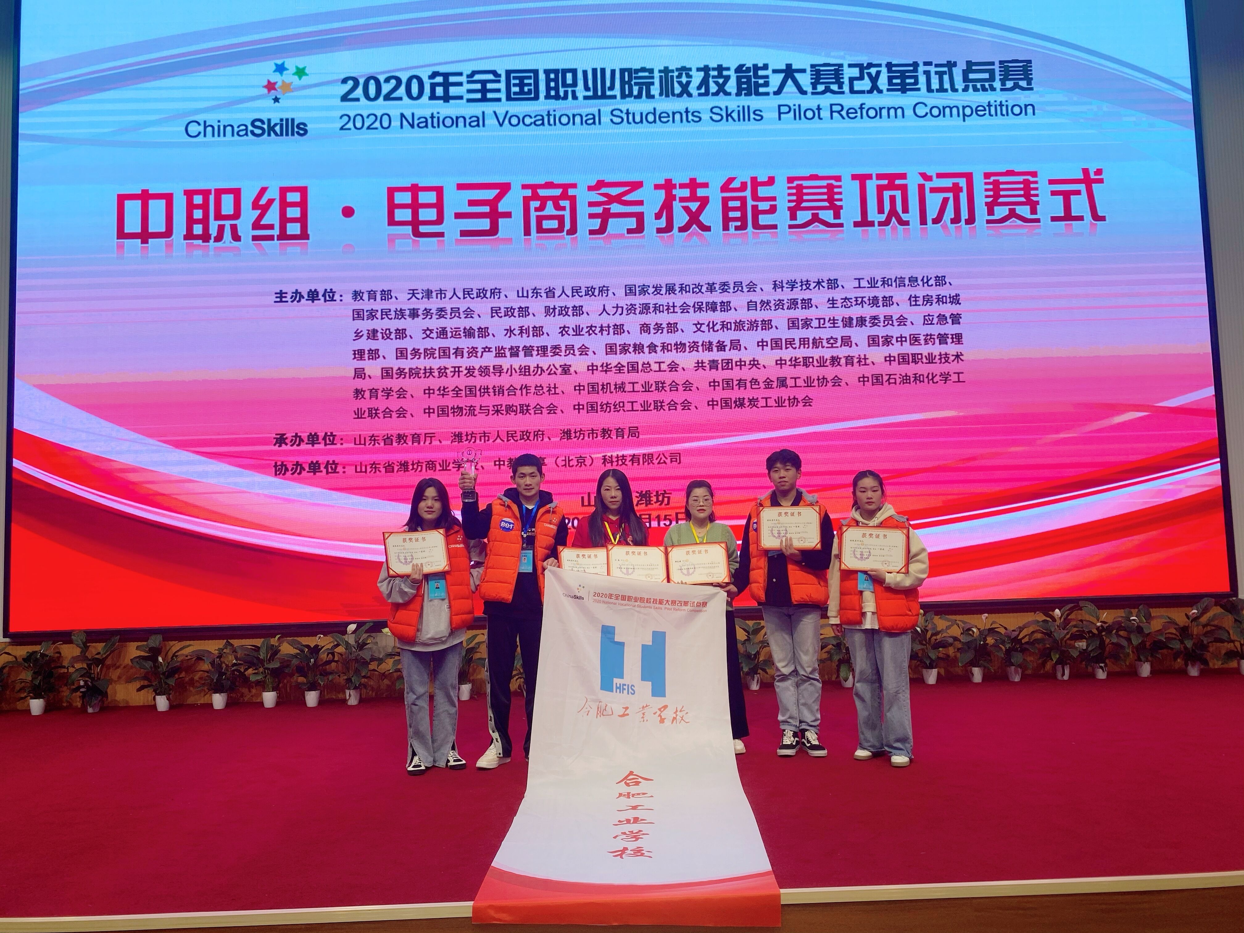 1月15日,在2020年全国职业院校技能大赛改革试点赛中职组·电子商务技能赛项中,我校电子商务代表队的康龙龙、余大鹏、陈何静、张依林四位同学,代表安徽省出战,经过激烈角逐,沉着应战,从来自全国的36支代表队144名选手中脱颖而出,一举夺得金牌!国赛,我们再获金牌!喜讯传来,全校上下为之欢欣雀跃!这是我校电子商务代表队在合肥教育名师工作室领衔人方英、郑美媛老师的指导下,继2019年夺得首金之后的再次夺冠!