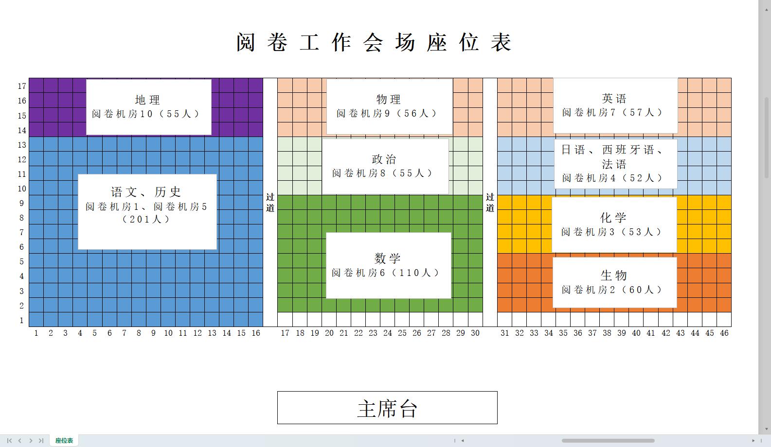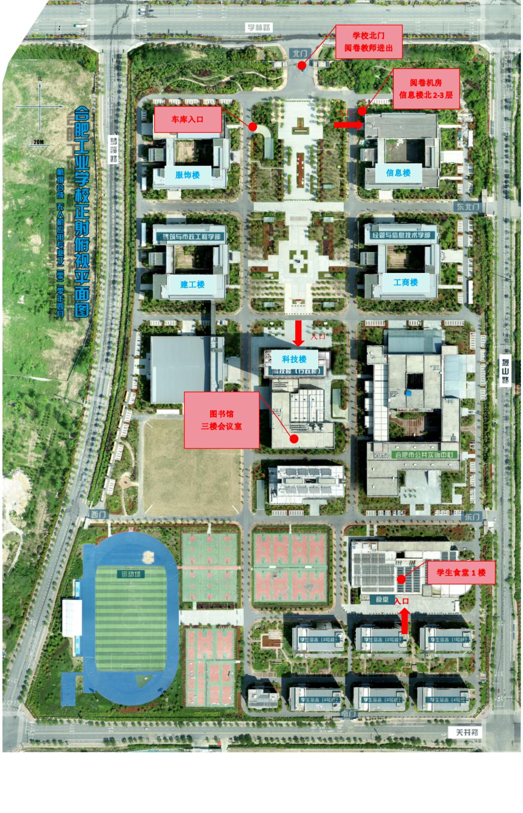 欢迎各位老师来我校参加“合肥市2026年普通高中学业水平合格性考试网上评卷工作”,阅卷工作会场座位表和合肥工业学校正射俯视平面图如下:
