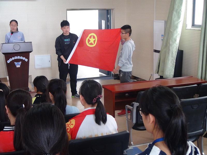 首先,全体起立唱国歌。然后由王君老师宣布42名新团员名单。团员们互相佩戴团徽,团徽代表着共青团,是共青团员肩负重任的标志。之后王君老师组织新团员宣誓,请新团员将自己的入团誓词牢记在心,并以此激励自己作为一名共青团员的荣誉感和责任感。紧接着是新团员代表15级高二(1)班方智同学和老团员代表15级高二(2)班余晓灿同学发言。陶勇部长也给新团员们提出了希望和要求,要求每个团员努力学习,积极向上,充分发挥团员模范带头作用,认清自己肩负的责任,努力履行团员的义务,用实际行动来表明自己无愧于共青团员这个光荣的称号。