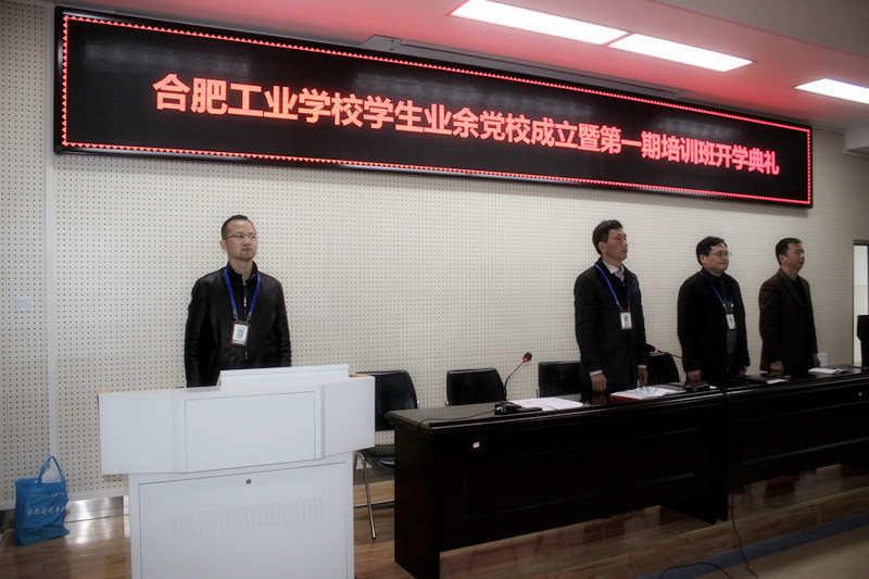 在庄严的国歌声中,我校第一期学生业余党校开学典礼拉开了序幕。首先由秦毅宣读了校党委决定及培训计划,来自经信学部14高职6班的周敏同学代表新学员上台发言,黎扬宣布培训班的学习章程。典礼上,校党委副书记、副校长赵华贵向新学员致词,他对新学员的到来表示了热烈欢迎,并充分肯定了学员们的先进意识,同时也提出了对学员们未来学习、生活的几点希望。学员们纷纷表示要利用好这次培训机会,把此次学习作为一个新起点,学习党的基本知识,努力提高政治觉悟。此次学生业余党校的顺利开课标志着合肥工业学校的学生党团工作又迈上了一个新的台阶。