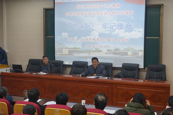 为全面深入学习宣传贯彻党的十九大精神,让党的十九大精神迅速走进校园、走进课堂, 2017年12月4日下午,市教育局总督学吴庆防同志走进合肥工业学校宣讲十九大精神。合肥工业学校部分党员教师,学生团支部书记代表参加本次报告会。