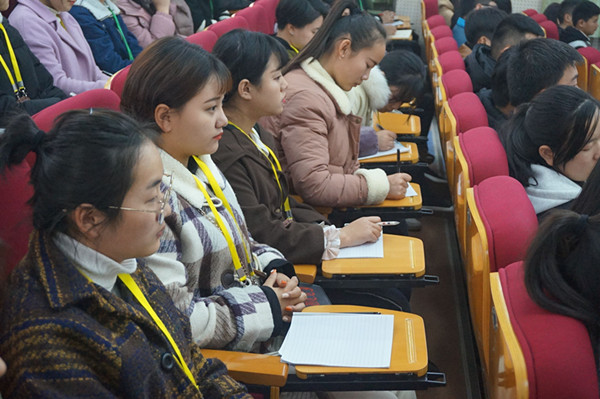根据报告会要求校团委组织安排110名班级团支部书记参加会议,他们认真聆听了吴督学的报告并且认真做笔记,聚精会神、受益良多。进一步把学习宣传贯彻十九大精神引向深入,切实在学懂弄通上下功夫、在贯彻落实上下功夫,坚决维护习近平总书记的核心地位,坚持以习近平新时代中国特色社会主义思想指导实践、推动工作。