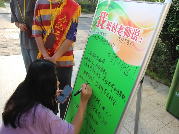 此外,校团委还在各学部门口放置了“老师,我想对您说”海报展板,同学们积极踊跃,在上面留下最想对老师说的祝福。一枝枝鲜花,一声声祝福,一份份真情,一句句真挚的问候,让教师节变得难以忘怀。