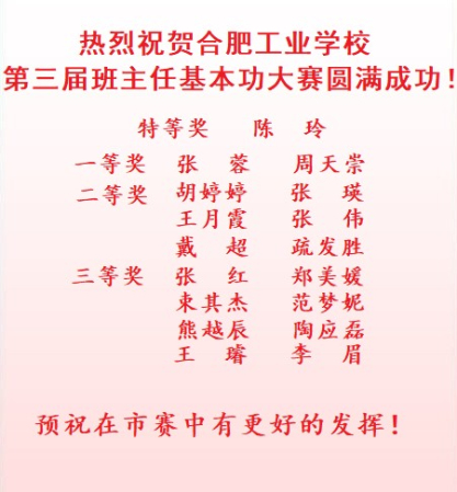 为弘扬新时期班主任风貌,加强班主任队伍建设,提高班主任的综合素质和专业能力,促进班主任师德修养,结合合肥市第四届中小学班主任基本功竞赛实施方案,合肥工业学校于3月27日,举行了合肥工业学校第三届班主任基本功校级决赛。