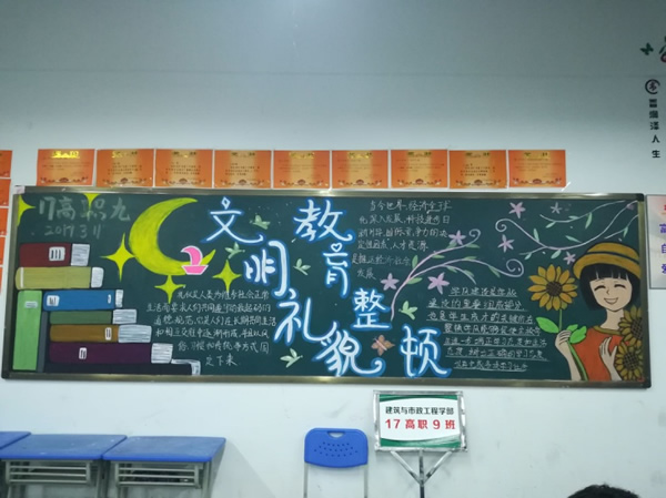 全校各班级同学,在班干的带领下,积极准备,认真设计且都按时完成。其中,经信学部的黑板报总体质量较为突出,优秀板报层出不穷,展现力强。各个班级都有自己的风格,内容精细,排版紧凑且充实,展示了我校学生的思维的活力,充斥了青春风采。同时,这个活动也充分说明了我校推行素质教育,培养文明礼仪的重要性。同时,也展现出学生对学校所布置活动的重视,尽力构建美丽校园。