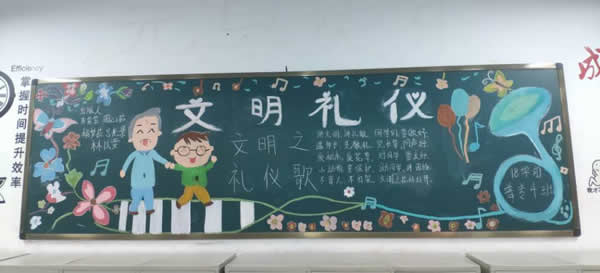 三月,是我校第三届文明礼貌月暨学风教育整顿月。为了进一步优化学校环境,净化学生思想,养成文明习惯,学生处号召并要求全校各班级出刊一期“文明礼貌”主题黑板报,并实行全面检查活动。
