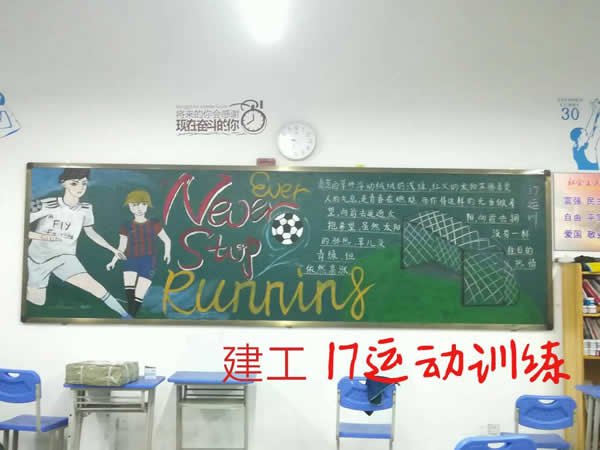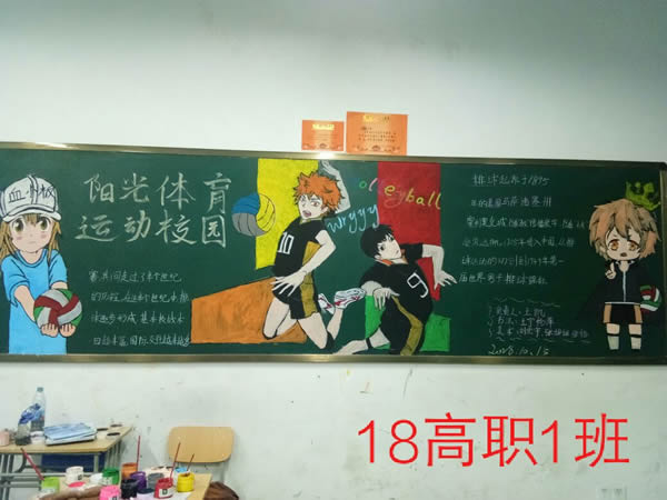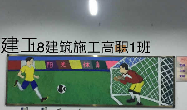 十月黑板报以“阳光体育 韵动校园”为主题,要求建工学部以校园足球为主题,经信学部以校园排球为主题,服饰学部以韵律操为主题。全校近两百个班级,在班主任的带领下,积极准备、认真设计,按时完成黑板报。大部分班级所展示的板报内容紧贴主题、创意新颖、版面布局合理。