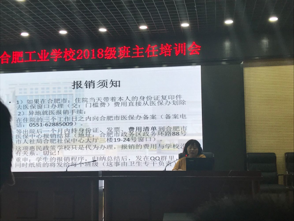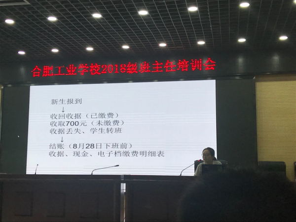 随后,安全保卫处胡智超进行安全教育平台建设进行培训,周楠楠就校园安全工作进行了部署,并强调班主任要加强学生财产安全意识、食品安全意识和水电消防安全意识,做好新学期学生请假制度的执行工作和记录工作;学校资助中心负责人蔡宗霞老生和财务处刘晓玲会计分别解读了学校资助政策及学生报名缴费的相关注意事项;团委司贺娟老师向新班主任阐明团员发展和学校社团建设情况;总务处徐义翠医生提出班主任一定要注重学生班级和寝室卫生,重视传染病传染情况,并以实际案例向各位班主任做了强调;招生就业处赵平副主任就新生报到流程和注意事项提出明确要求;教务处蒋月珍处长解读了学籍管理制度,并对新老生报到时限进行重点强调;学生处张克难副处长就学生宿舍安排、入学教育等进行工作布置。