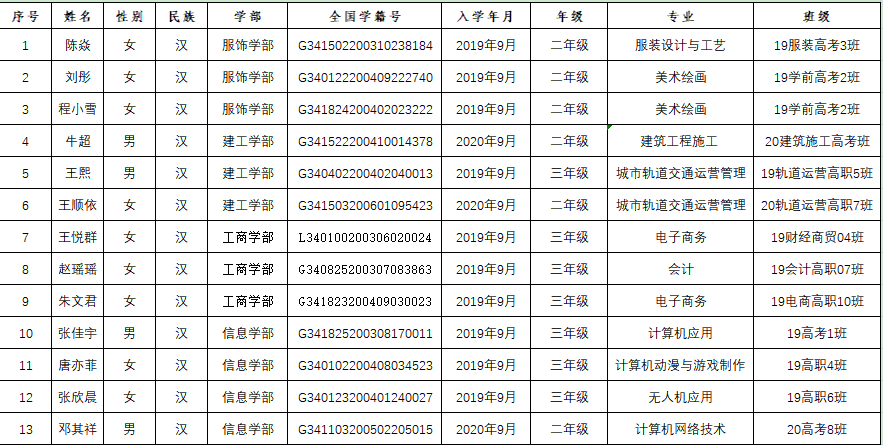 根据合肥市学生资助管理中心《关于做好2021年合肥市中等职业教育国家奖学金有关工作的通知》精神,经班级推荐申报、各学部组织、评选、报学校国家奖学金评审领导小组批准,拟推荐下列13位同学上报为我校中职国家奖学金候选人,现予以公示,公示时间为9月26日至9月30日。公示期间,全校师生如有异议,请向学生处资助中心反映,联系电话(0551-65505017)