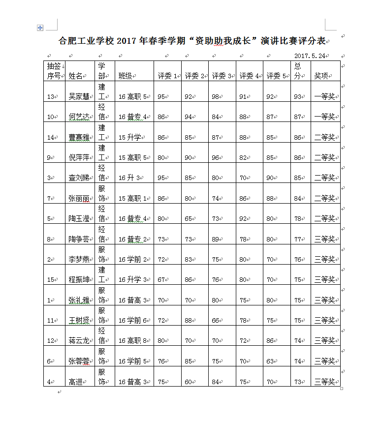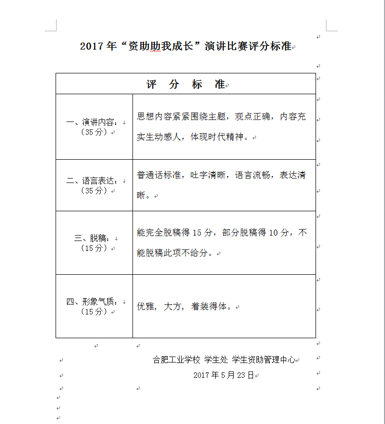 合肥工业学校2017年度首届“资助助我成长”演讲比赛评分标准、评分表及获奖名单
