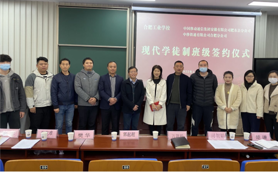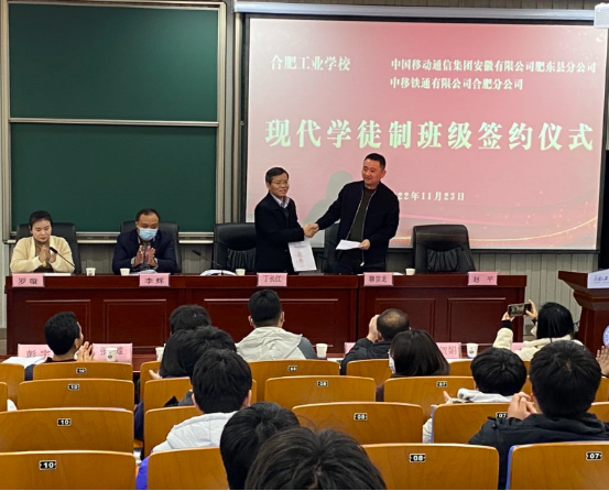 为深入推进学校校企合作,产教融合工作,1124日下午,我校与中国移动通信集团安徽有限公司肥东县分公司、中移铁通有限公司合肥分公司联合举行了现代学徒制班级签约仪式。中国移动肥东县分公司副总经理丁长江、校园部主任万箴毅、校园部经理彭宇、校园部营销专员樊华,中移铁通合肥分公司支撑中心经理李辉、家客中心主任郭起超,信息学部主任聊宗龙,招生就业培训处处长张克难、副处长赵平、楚谦,信息学部副主任罗璇,22级通信工程普专2班班主任郑诗瑶、专业教师陆玥及班级全体同学参加了本次活动。