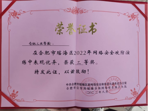 我校学生胡志强、秦子皓、刘业彤组成了合肥工业学校团队与多家专业网络安全公司一起,于20228月23日完成了全市的护网演练,学生展现的专业素养,在与科大讯飞、启明星辰、合肥电信等顶尖专业团队的比拼中,不落下风。在演练中发现的问题和隐患,及时与教育局进行了沟通,分析问题,提出对策,写出情况总结,于9月10日前指导问题单位完成整改避免了出现安全事故造成社会影响,健全网络安全防护措施,确保了落实重要时期网络安全保障工作。