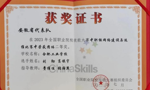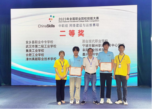 7月24至27日,2023年全国职业院校技能大赛“网络建设与运维”赛项在常州刘国钧高等职业技术学校举行,校党委副书记、校长孙健亲自带领我校网络建设与运维赛项团队前往参赛。我校信息技术学部刘彻、葛镇宇同学在费维佳、张海燕两位老师的指导下,代表安徽省与全国101 所中职院校选手同台竞技。经过激烈的比赛角逐,两位同学凭借专业的技术和稳定的发挥,获得国赛二等奖。