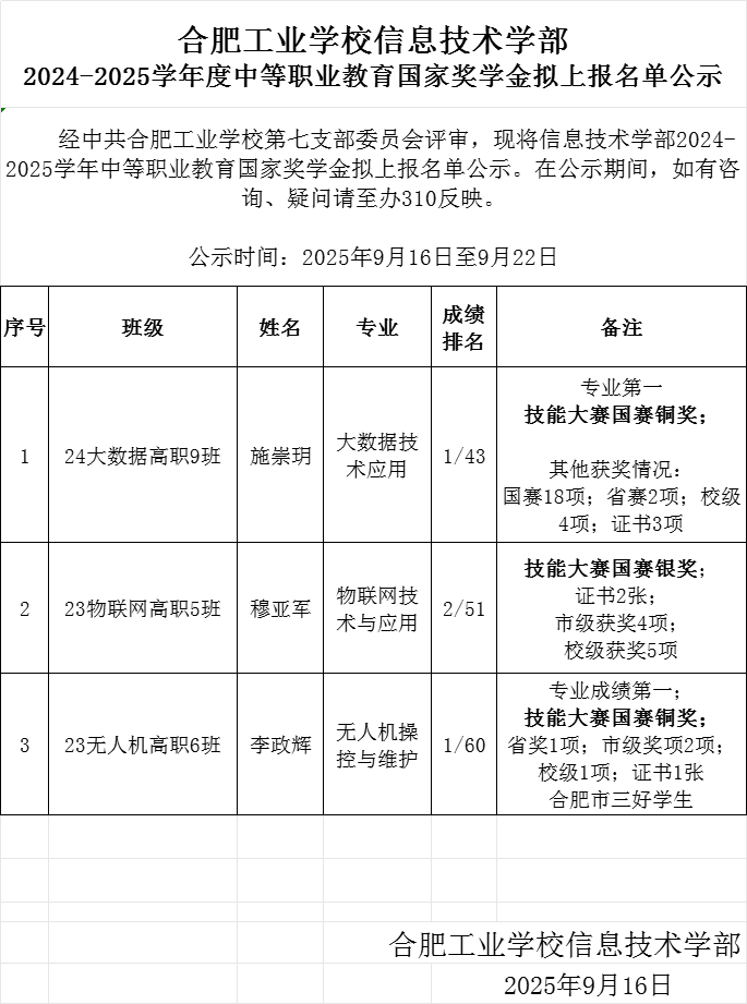 合肥工业学校信息技术学部2024-2025学年度中等职业教育国家奖学金拟上报名单公示