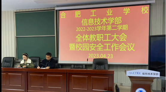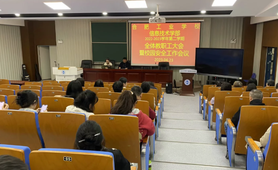 4月23日下午信息技术学部在二楼阶梯教室召开2022-2023学年第二学期学部全体教职工大会暨校园安全工作会议,会议由聊宗龙主任主持,全体教职工参会。