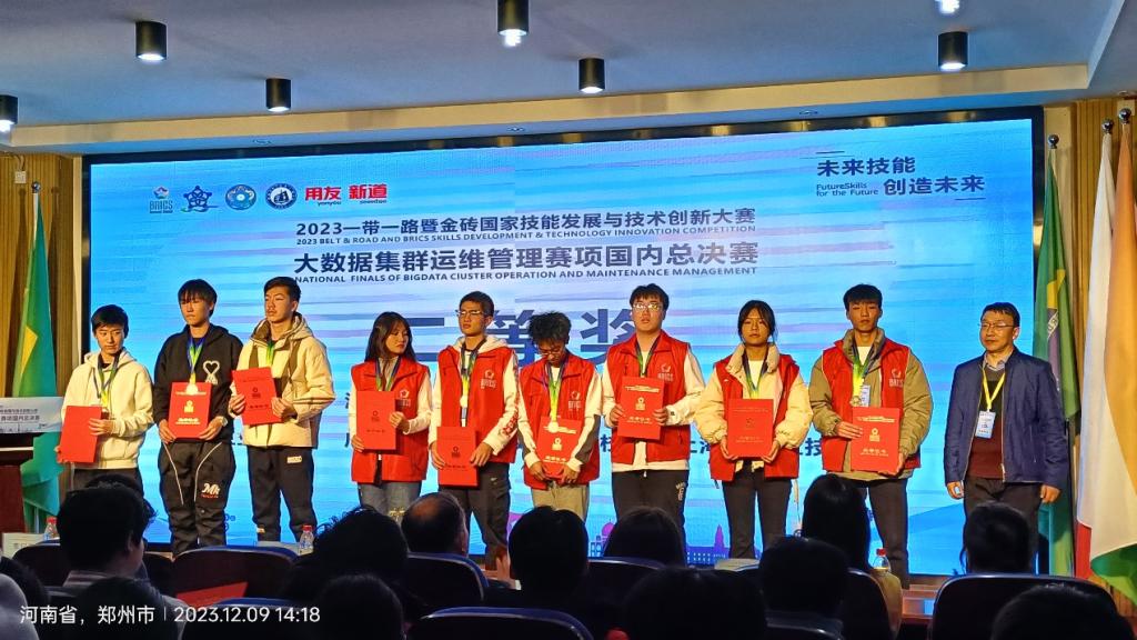 12月9日,2023一带一路暨金砖国家技能发展与技术创新大赛“大数据集群运维管理赛项”国内总决赛(中职组)在郑州市电子信息工程学校举办,我校王浩、陈文龙、朱梦茹(均为21高职5班)获得团队二等奖,魏飚、童亚运获得优秀指导教师,合肥工业学校获得优秀组织奖。本次比赛由线上全国选拔前三十名队伍参加线下决赛。