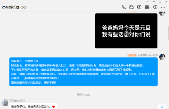 2025年12月31日晚,这部承载着全班同学心意的视频通过班级家长群发送至各位家长。许多家长在收到这份特殊的新年礼物后深受感动,纷纷在群内留言:“看到孩子这么懂事,心里特别温暖”、“这是收到最好的元旦礼物”。
