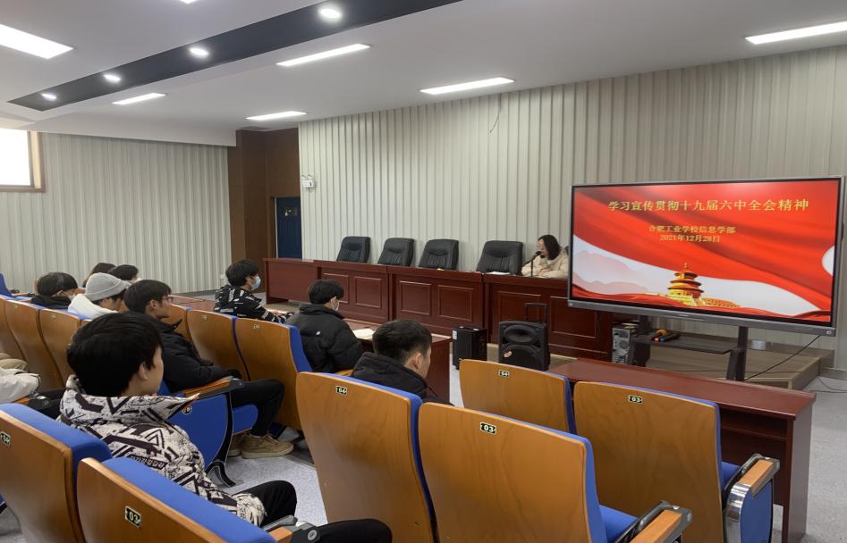 学习贯彻党的十九届六中全会精神是当前和今后时期的一个重大任务。根据党史学习教育工作安排,12月28日中午12点30分,信息学部团总支在学部二楼阶梯教室开展学生代表学习十九届六中全会精神专项活动。本次宣讲的对象是学部全体团支部书记、全体社团社长、副社长,王月霞老师担任本次的主讲老师。
