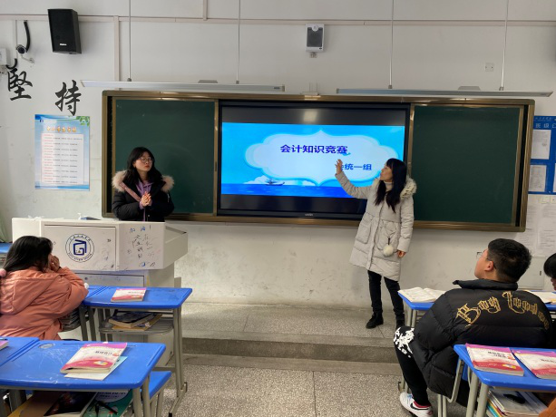 比赛分为三个环节。第一环节是会计科目你说我猜,大屏幕展示会计专业术语,两人为一组,一人描述,一人猜。第二环节会计知识竞答以简答题的形式展开,10秒钟时间思考,举手抢答,答对得一分,答错不得分。第三环节会计分录明脑快,设置时间为一分钟内,通过举手获得上黑板的答题机会。