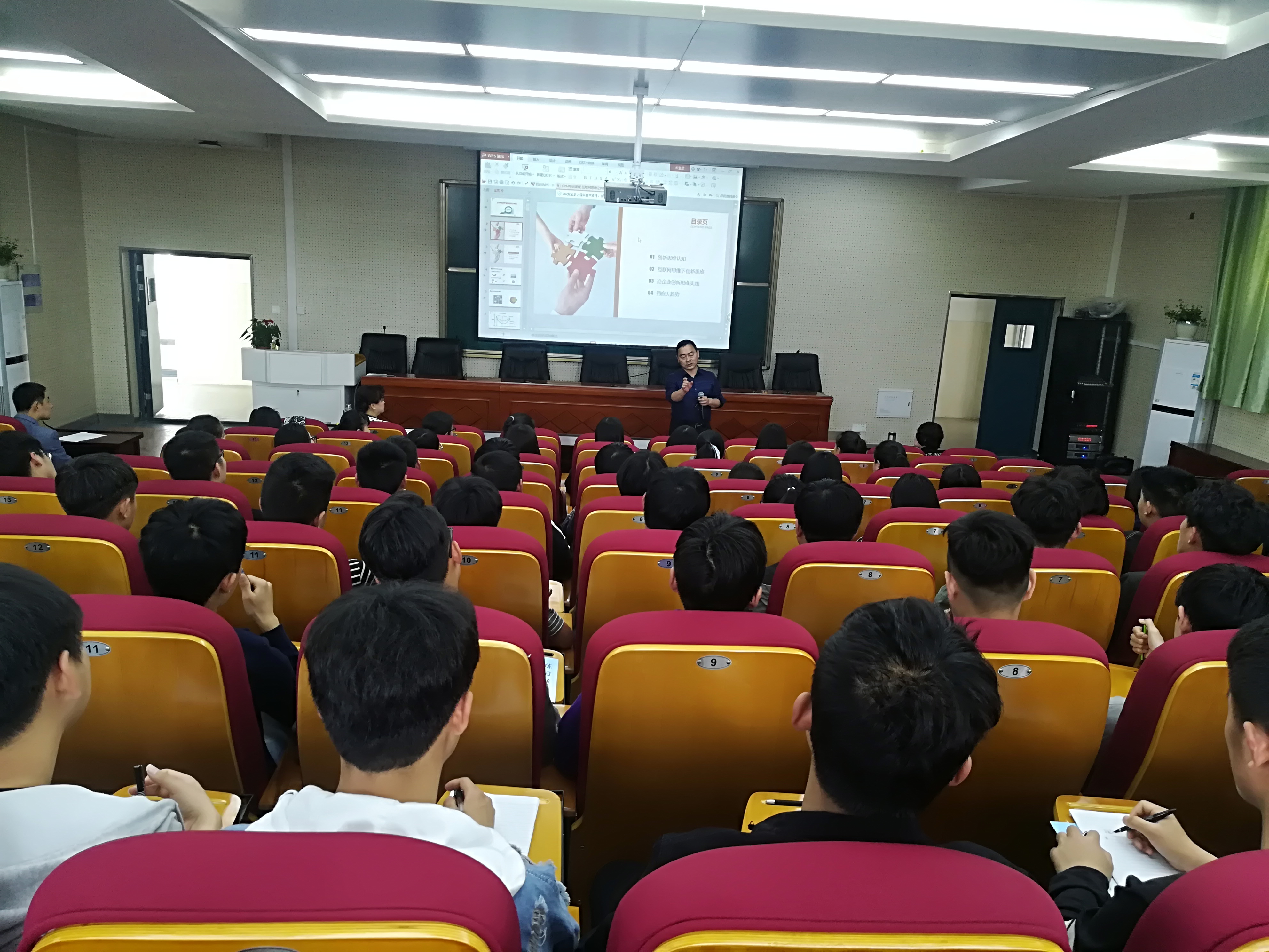 讲座不间断进行两个小时,重点针对互联网环境下传统企业营销模式的转变提出九大互联网思维,跨界思维、平台思维、大数据思维等。陈老师的讲座深入浅出,幽默风趣。