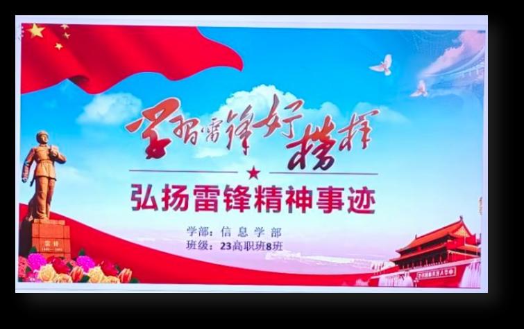 雷锋精神是我们中华民族宝贵的精神财富。六十多年来,它激励着一代又一代的青少年健康成长,促进了社会文明的进步,社会风气的好转。校园是青少年健康成长的摇篮,三月是让雷锋精神吹遍校园每一个角落的季节,又是一年学习雷锋活动月,信息学部通过广播班会作了充分动员,所有的教师和学生积极响应,从身边的小事做起,从身边的人帮起,23高职8班紧紧围绕学雷锋月主题,组织各项活动,努力把学雷锋活动落实到实处。同学们在活动过程中得到了锻炼,在锻炼中得到了成长。雷锋精神像春风一样拂过了同学们稚嫩的心灵,播下了乐于奉献乐于助人的种子。也取得了可喜的成效: