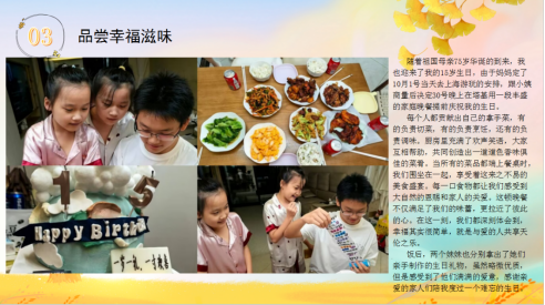 在“品尝幸福滋味”环节,同学们精心选购食材,与家人朋友共同制作美食,不仅品尝到了美味佳肴,更感受到了亲情的温暖和友情的甜蜜,整个空间弥漫着幸福的气息。