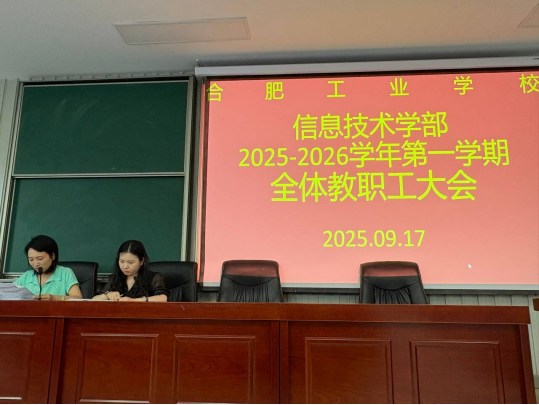 2025年9月17日下午3时40分,合肥工业学校信息技术学部在2阶教室组织召开全体教职工大会。合肥工业学校聊宗龙副校长、信息技术学部司贺娟副主任、信息技术学部罗璇副主任及学部全体教职工出席会议。会议由司贺娟副主任主持。