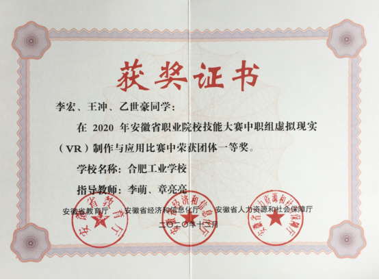 2、虚拟现实项目在职业技能大赛获得省、市赛一等奖,国赛铜奖