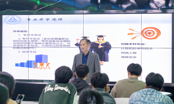 随后刘晓川院长就学院历史、基地建设、专业发展等向师生们做了详细介绍。胡春雷主任围绕高水平专业建设、人才培养、产教融合、升学途径、科技创新等方面给我校师生做了专项讲座。方康总监就产业学院的运营方式、校企合作、岗位实习、科技成果转化和校园信息化建设亮点等向师生们进行重点介绍。